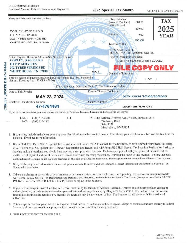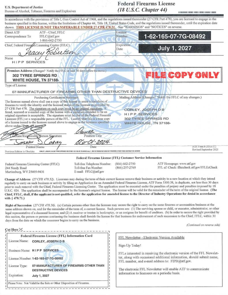 HIPP Customs LLC Abandonment Policy for firearms Manufactured & Repaired & Firearm Transfers
